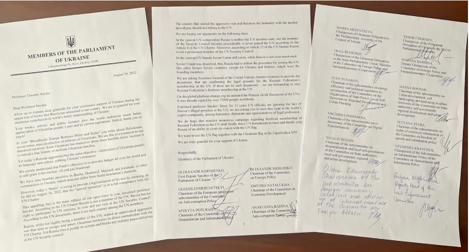 Як йдеться у повідомленні, перший віцеспікер Верховної Ради України Олександр Корнієнко, голови Комітетів та голови парламентських делегацій України в міжнародних інституціях звернулись у відкритому листі до історика Тімоті Снайдера з проханням підтримати в наукових колах дослідження незаконності зайняття російською федерацією місця СРСР в Раді безпеки ООН і самій організації.