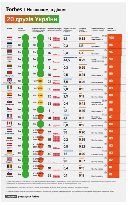 У новому рейтингу країн – друзів України за версією Forbes перше місце, як і раніше, посідає Польща. До першої п’ятірки також увійшли Естонія, Латвія, США та Литва.